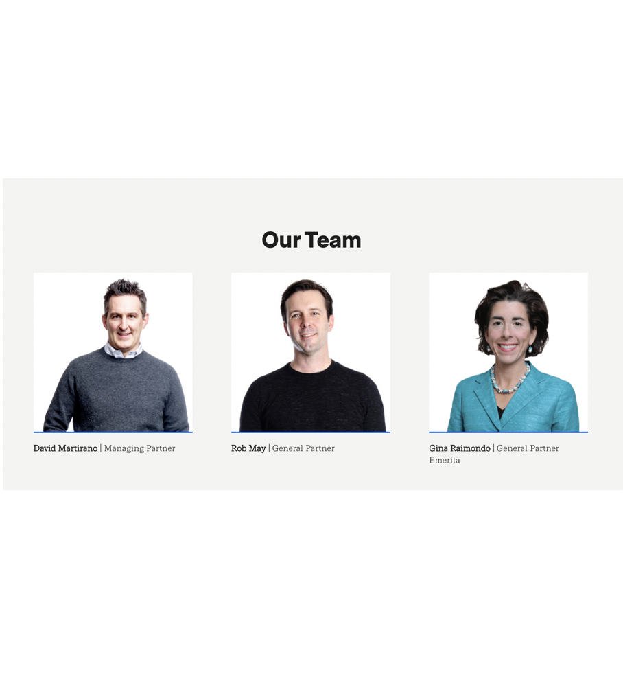 On the venture firm's website adjacent to the top managers’ photos including Raimondo reads, “We are a team of former founders, builders, number-crunchers, spreadsheet masters, merger and acquisitions experts, operators, and financial analysts.”