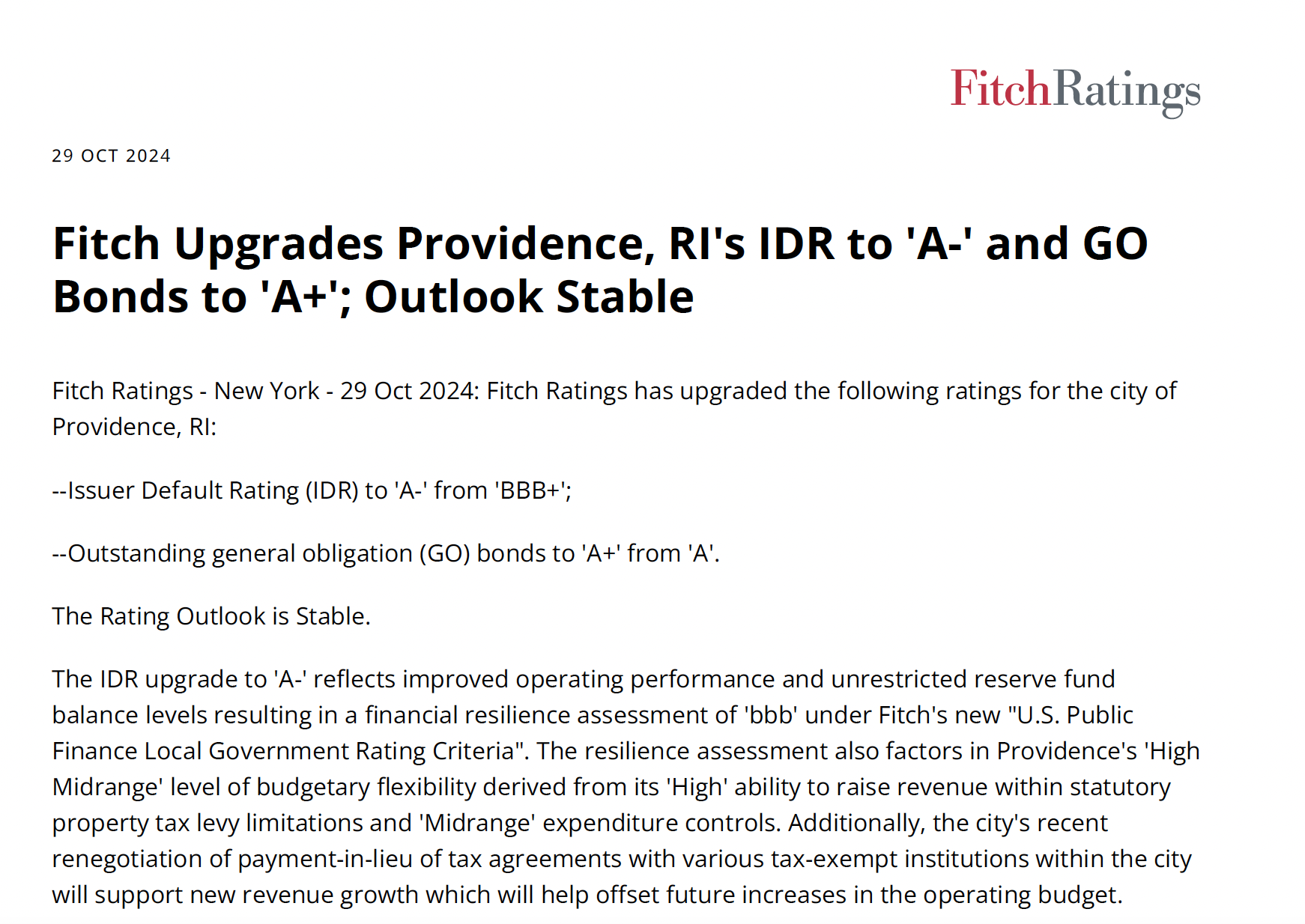 Fitch Issues Rating Report on the City of Providence