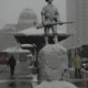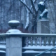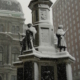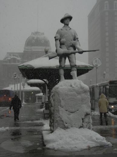 The Civil War figures on this 1871 memorial are warmly dressed, and a good thing, too, as they stand cloaked in a cold white substance recently fallen from the sky. The adhesive snow renders the folds of their clothing ecstatic. The doctor has consumed doughnuts at the base of this statue many a time, but never in the snow.
