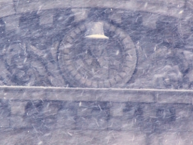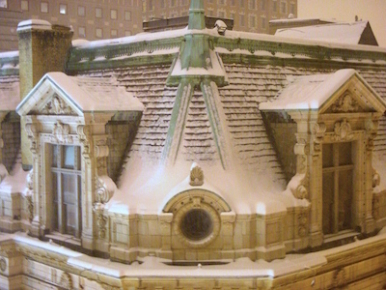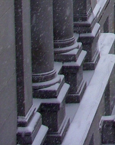 One of classical architecture’s great contributions to civilization has been to offer a gentle place of rest to snow, allowing the eye of passersby to rest on beauty they might otherwise overlook. This bank of pillars at City Hall upholds the third story of that pile of architecture. It was part of the doctor’s lofty residential view in 1999-2010.