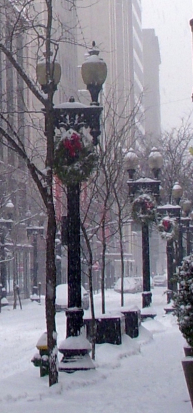 Lampposts such as these installed along the former pedestrian mall when it reopened to traffic in 1989 help raise Westminster Street to a world-class level of beauty. The design, made during the brief Paolino mayoral administration, enchants Dr. Downtown. With or without snow, classical lampposts mingle nicely with the young trees and the old buildings. Bellissimo!