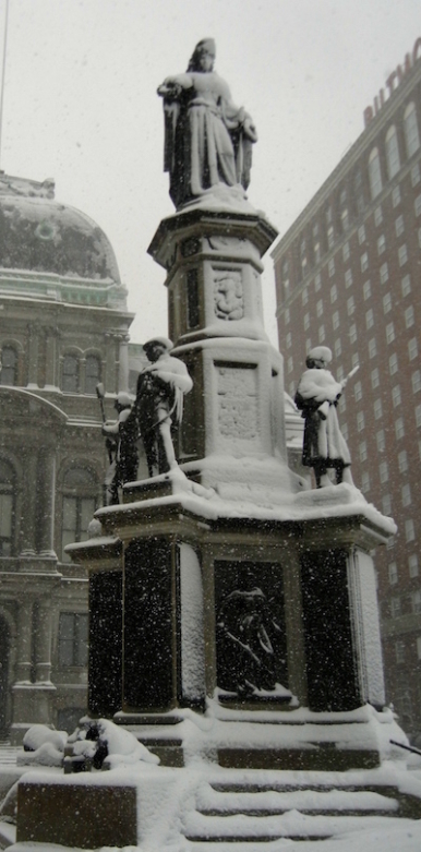 Nobody, not even Dr. Downtown, knows what Roger Williams looked like. His features have not come down to us through a bust of his head nor a portrait of his visage. His fictional appearance is equally conjectural in this photograph. Snowflakes hurrying by obscured the disapproval of his expression looking down on us from City Hall (1878).