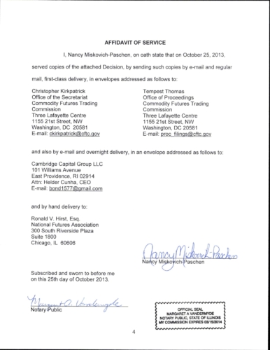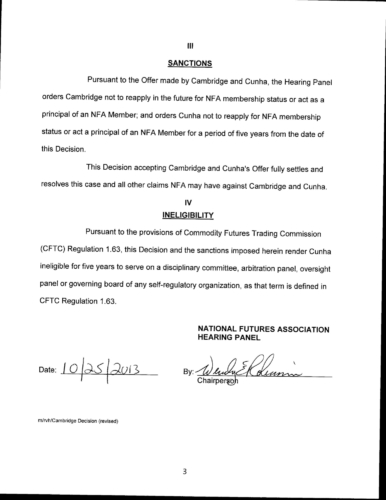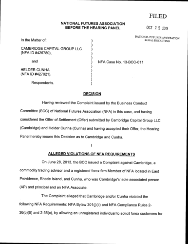 After multiple complaints against Cunha and his company Cambridge Capital Group, the NFA disciplinary council “ordered Cunha not to reapply for NFA membership status or act a principal of an NFA Member for a period of five years from the date of [the] decision" in 2013.
