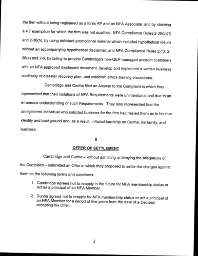 Cunha defended his actions, "In terms of the NFA complaint, I was a one man operation. I took care of client assets, and after I worked in NY I moved back home and I started Cambridge Capital Group, when this all came about. I didn't have a compliance officer about what to put on and not to put on materials, and I missed some disclosures about what to put on with the NFA when they asked to look at all my files, which I gave them access to. I had zero complaints. The only complaint was from the NFA."