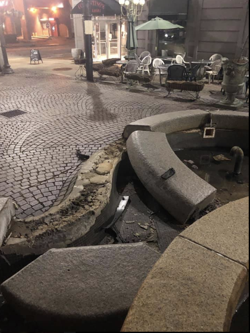 Fountain at DePasquale Square - broken and damaged PHOTO: Mike WhiteThen, a car crashed into the fountain and left the icon of DePasquale Square damaged again.