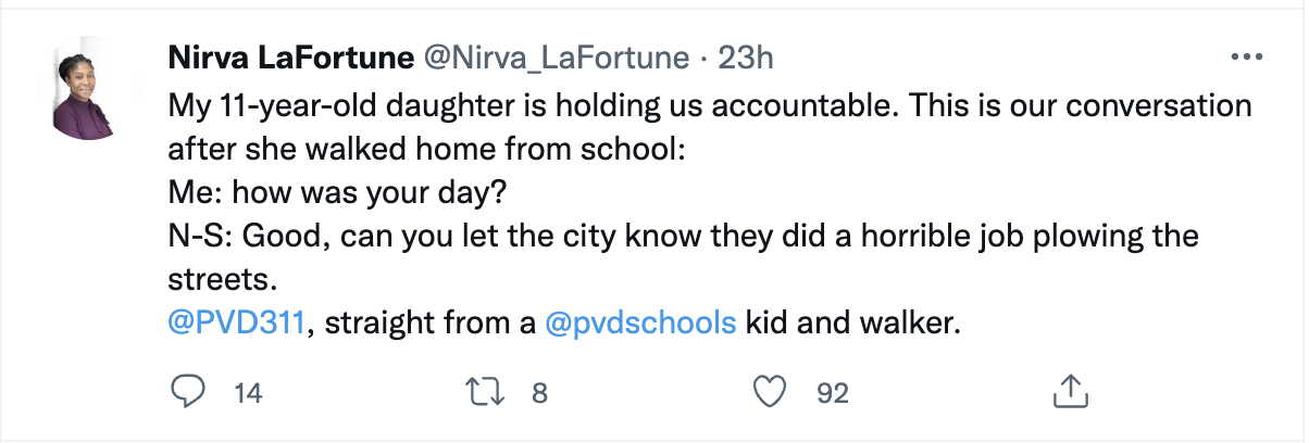 On Tuesday, Providence City Councilor Nirva LaFortune Tweeted the following conversation with her daughter.