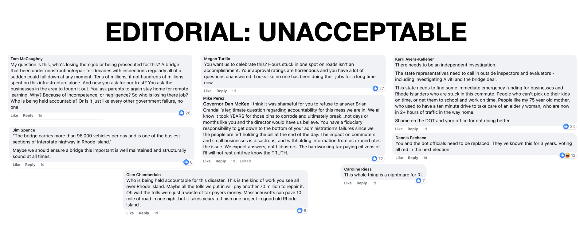 House Minority Leader Michael Chippendale's comments are on point when he said, "The Executive Branch in Rhode Island is responsible for maintaining and developing our state’s infrastructure – including the I-195 bridges. The Governor selects department heads and directors and prioritizes the areas where those departments focus. The responsibility for this avoidable disaster is undebatable."