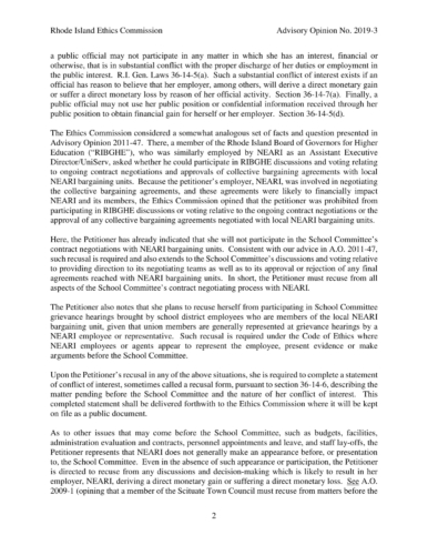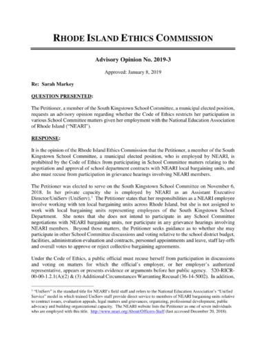 "The Petitioner is not prohibited from participating in discussions and voting relative to decisions involving budgets, facilities, administration evaluation and contracts, personnel appointments and leave, and staff lay-offs, provide that NEARI is not a party or participant to the matter before the School Committee, and further provided that there is no reasonably foreseeable directory monetary gain or loss to NEARI," wrote the Ethics Committee.
