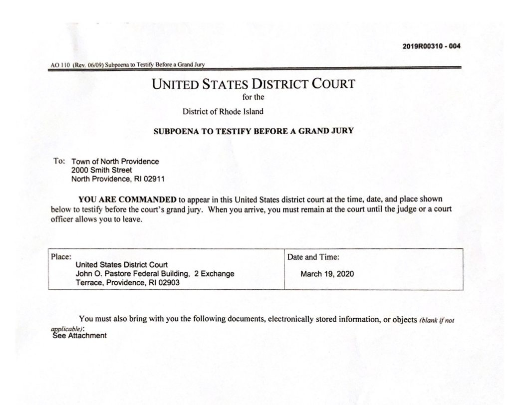 The subpoena was issued to the City of North Providence in March of 2020 and requested testimony before the grand jury and the production of documents relating to Dennis Stone — now a Lieutenant with the North Providence — and fellow officer Detective Christopher Petteruti.