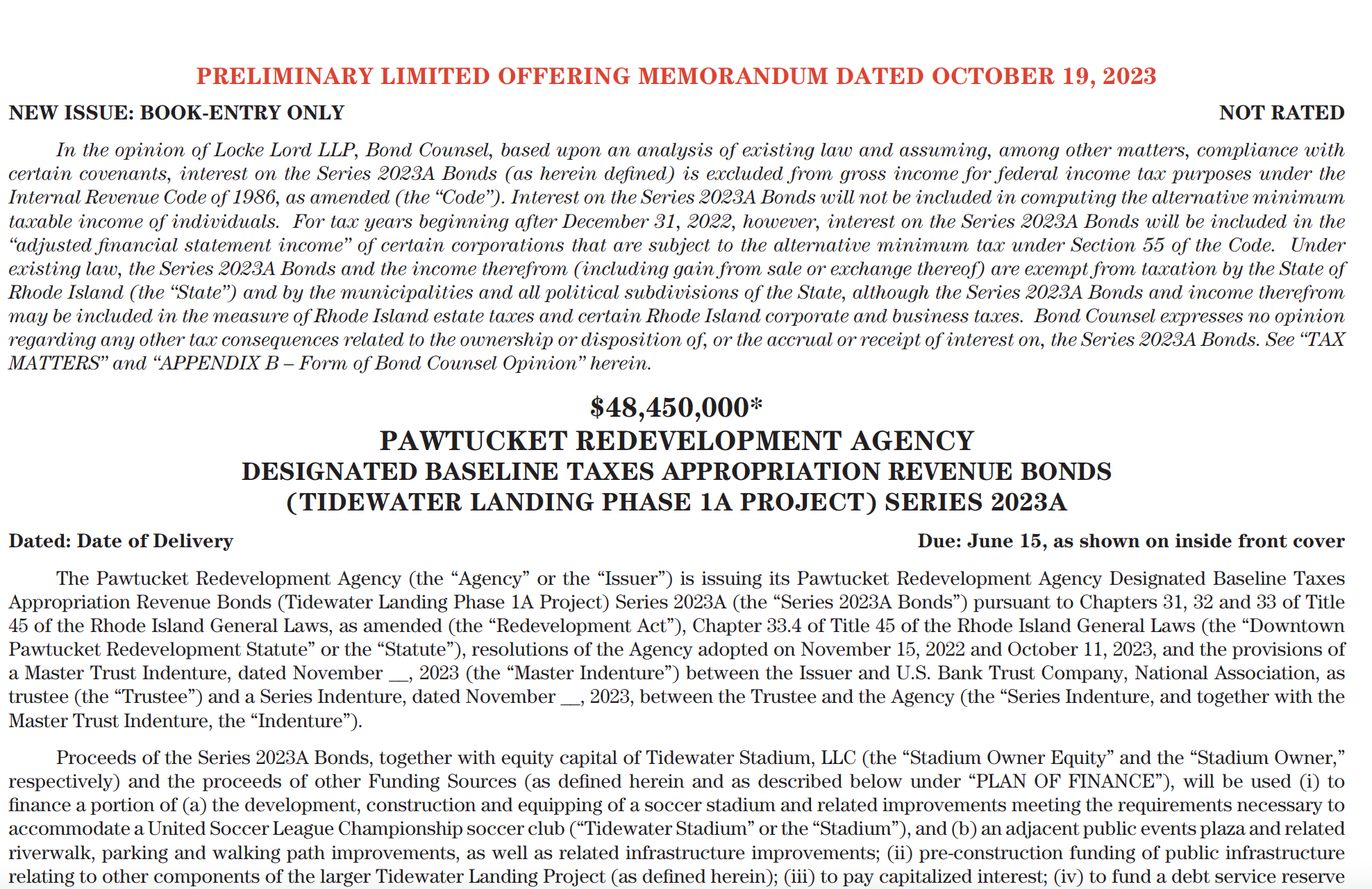 The document marked the Preliminary Limited Offering Memorandum and dated October 19, 2023, unveils that The Pawtucket Redevelopment Agency — on behalf of the city would fund the privately owned Tidewater Landing stadium.