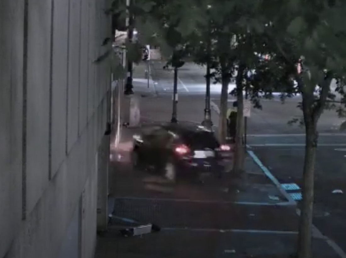 The driver peels away, turns around at Kennedy Plaza, and then drives on the city sidewalk, crashing into the building.