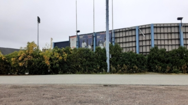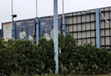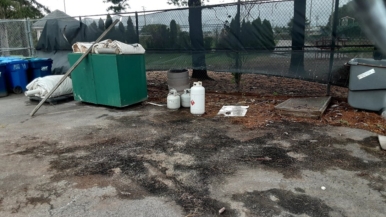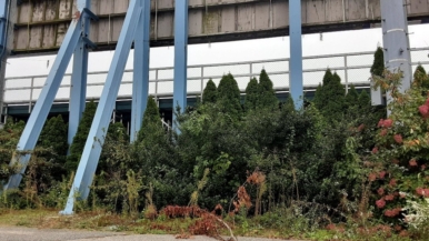 The weeds in the outfield area under the scoreboard are more than 8 feet tall. Trees and shrubs are not maintained.