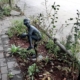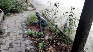The beloved statue area is overgrown and covered in weeds in many areas.