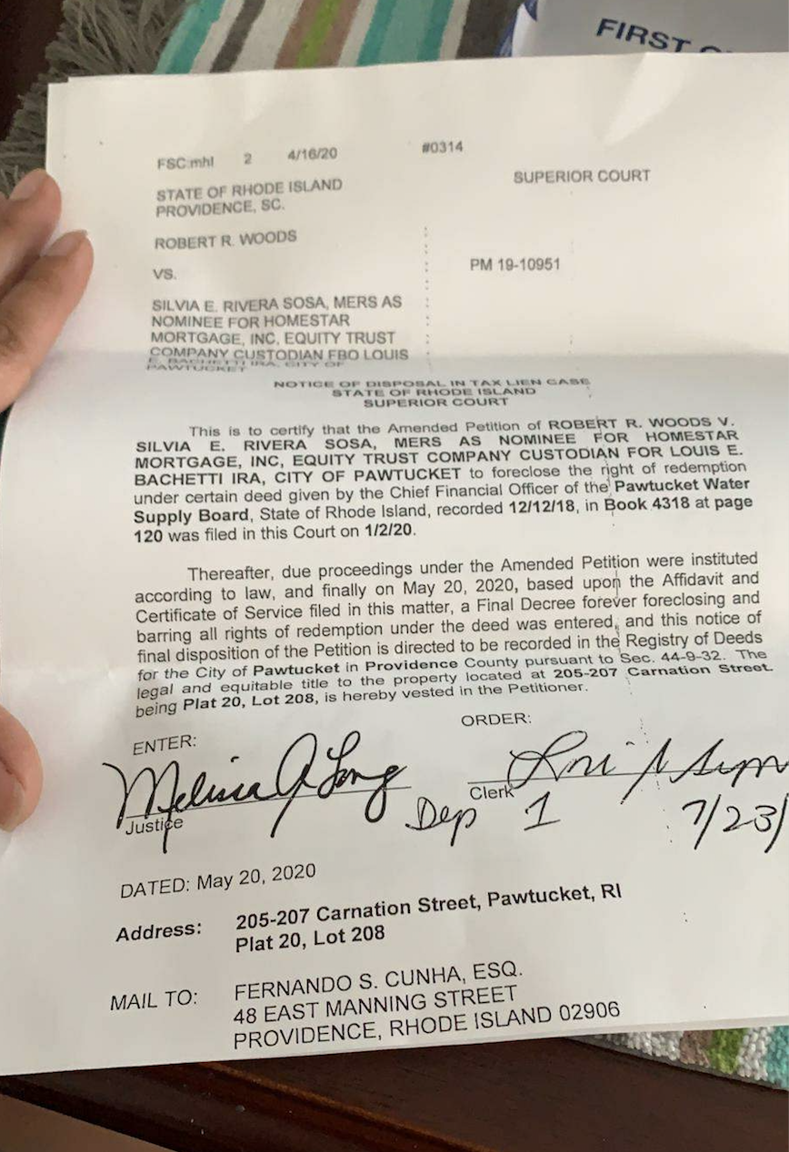 Until Thursday, Rivera says she was unaware that the house had been transferred. Earlier this year, she did receive notification from Superior Court of Rhode Island of an issue with the house and contacted the clerk's office and was told that nothing would take place due to the courts being shut down by the coronavirus.