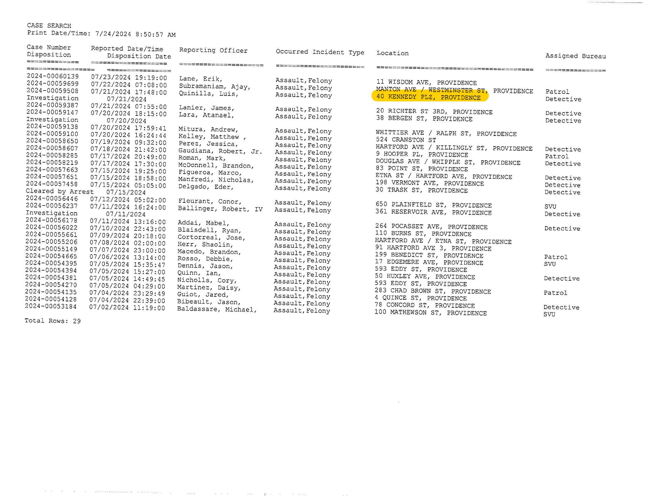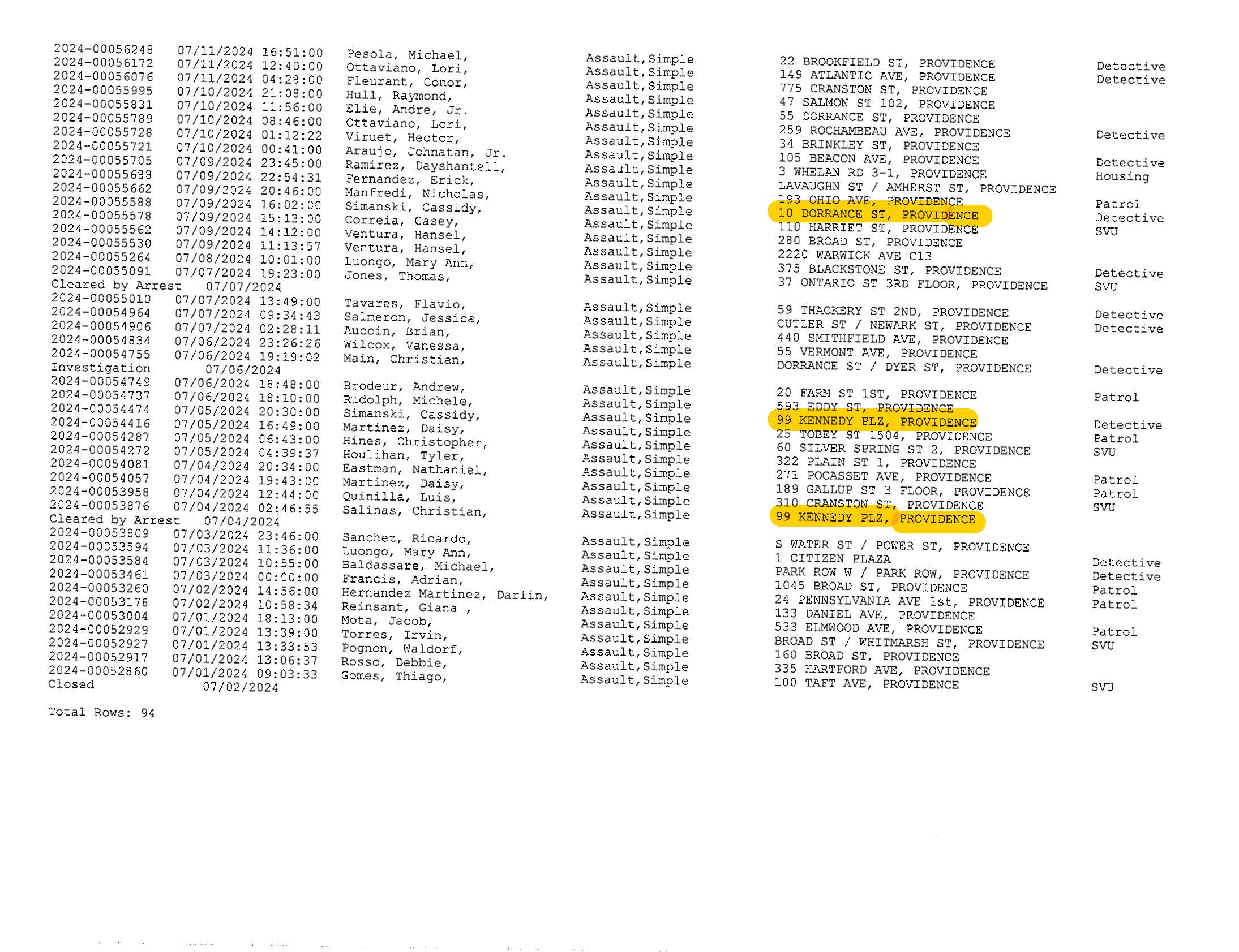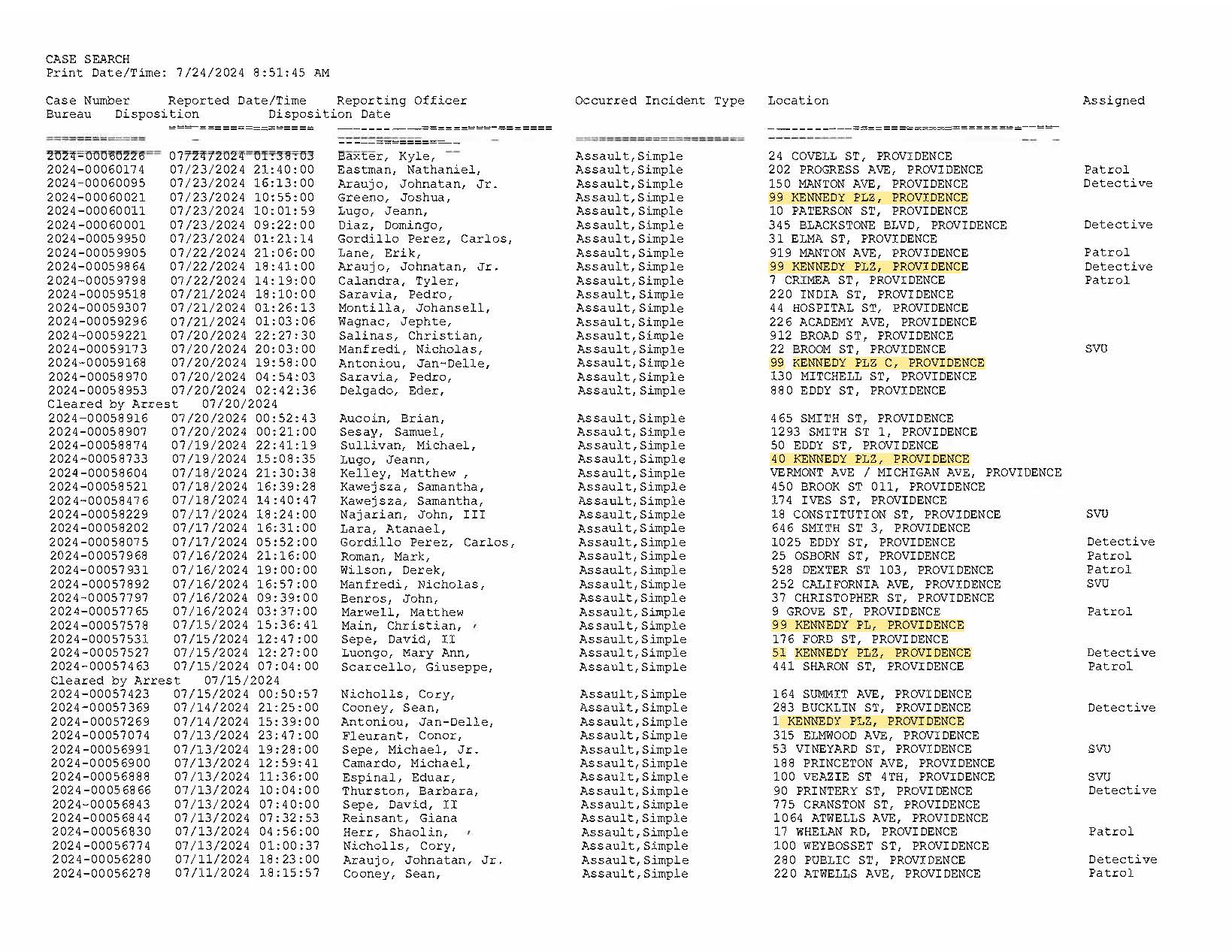 The following pages, provided to GoLocal by the city of Providence, list the assaults during the first 23 days of July.