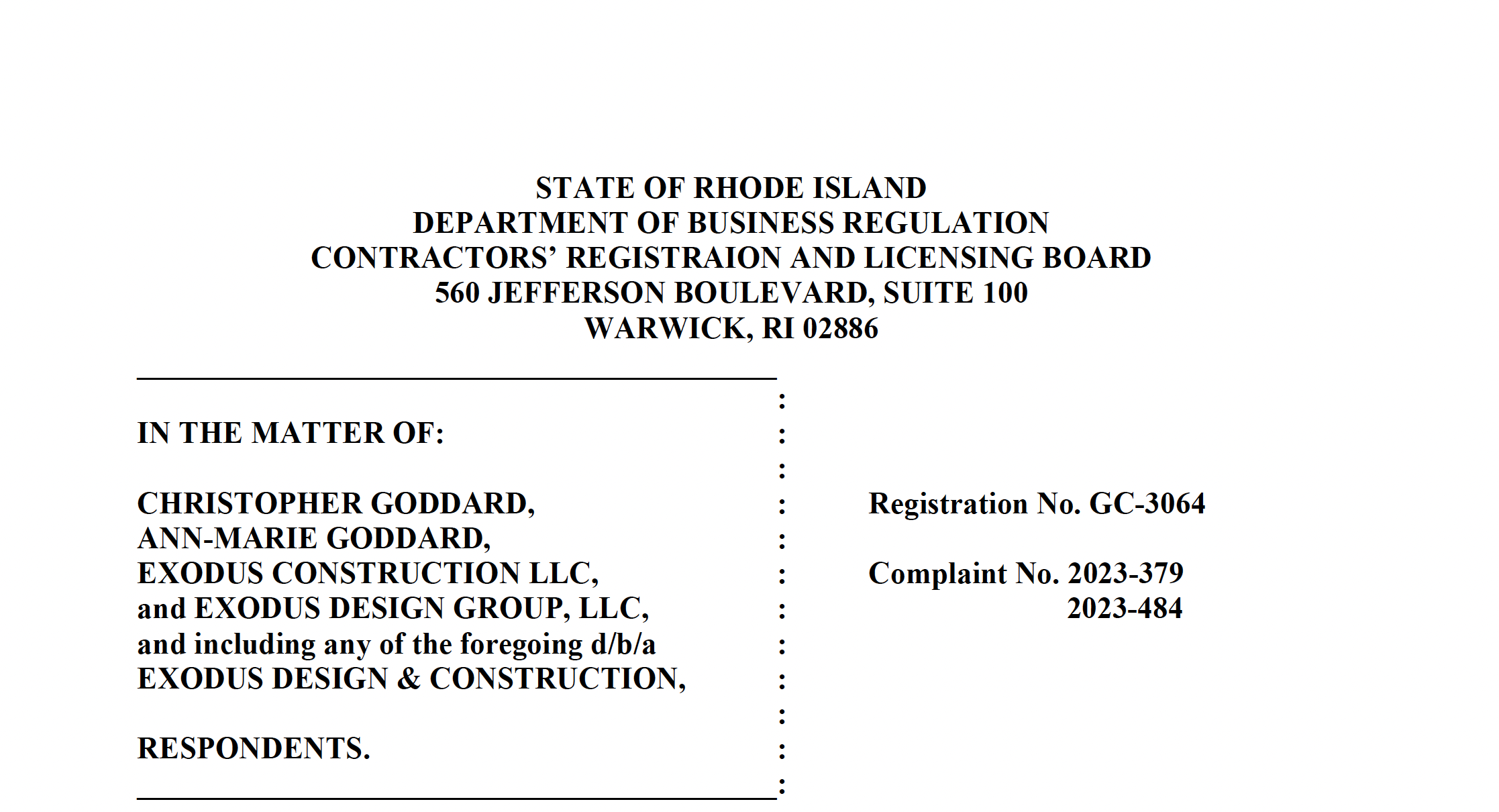 According to the DBR, "During the five-month period beginning July 11, 2023, through December 20, 2023, Respondents and/or Respondents’ business entities have been sued in seven (7) separate civil actions filed in Rhode Island Superior Courts involving numerous breaches of construction related contracts and Respondents’ failure to apply funds they received from consumer property owners to pay for materials and/or labor provided by building materials suppliers and/or subcontractors, which has resulted in mechanic’s liens being filed and enforcement sought against Respondents and also against the consumers and the consumers’ properties."