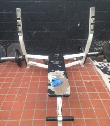 Here is another picture of a bench press rack that has been used a few too many times. This rack is ripped up and has lost pretty much all of its padding.