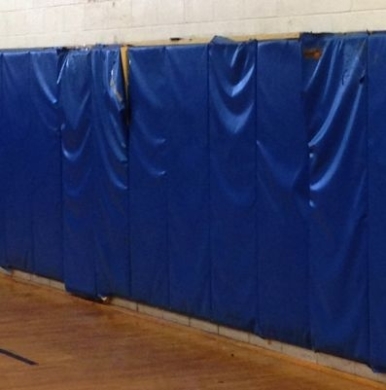 Inside the basketball gym at Neutaconkanut Recreation Center the padding on the wall is very worn and ripped along the top.