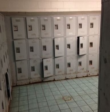 The lockers in the men's room are extremely rusty from top to bottom and are beat up.