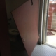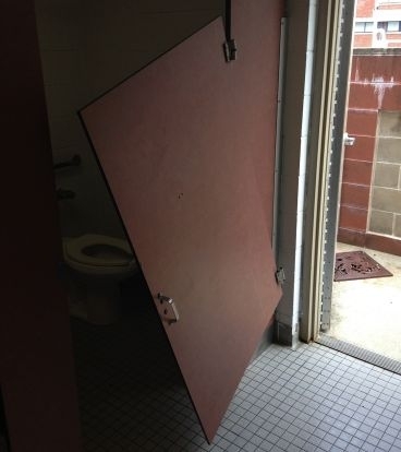 The door to one of the stalls in the men's restroom is hanging by a hinge.