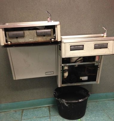 One of the water fountains at Selim Madelin Rogers is missing muliple cover pieces and has a small leak.