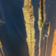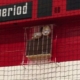 The lights underneath the scoreboard in the basketball gym appear to have been hit a few times to the point where one of the lights is barely attached.