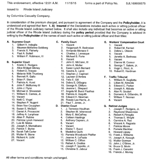According to court documents, the policy with the Columbia Casualty Company has an annual premium of $69,737 with a $2,789.48 premium tax which includes current Supreme, Superior, Family, District, Workers’ Compensation, and Traffic Tribunal Court judges - as well as 16 retired judges.