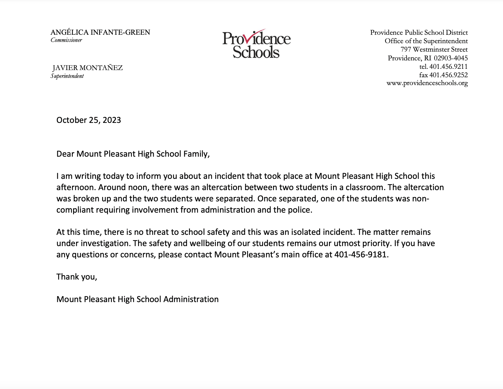 First and foremost, the safety of our students and staff are our top priority – and we want to thank the staff and school community for their prompt response to what occurred yesterday at Mount Pleasant High School. An incident occurred yesterday at Mount Pleasant High School.