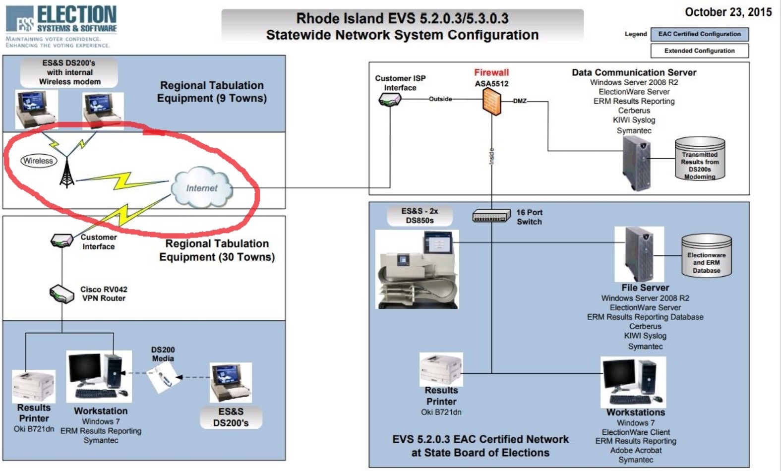 “ES&S advises election officials to configure the external firewall that protects the DMZ to only accept connections from IP addresses assigned to the voting machines. And election officials in Rhode Island, which uses ES&S’s DS200 machines with modems, told me that the modems only transmit for about a minute, which wouldn’t be sufficient to hack into voting machines or results servers.”