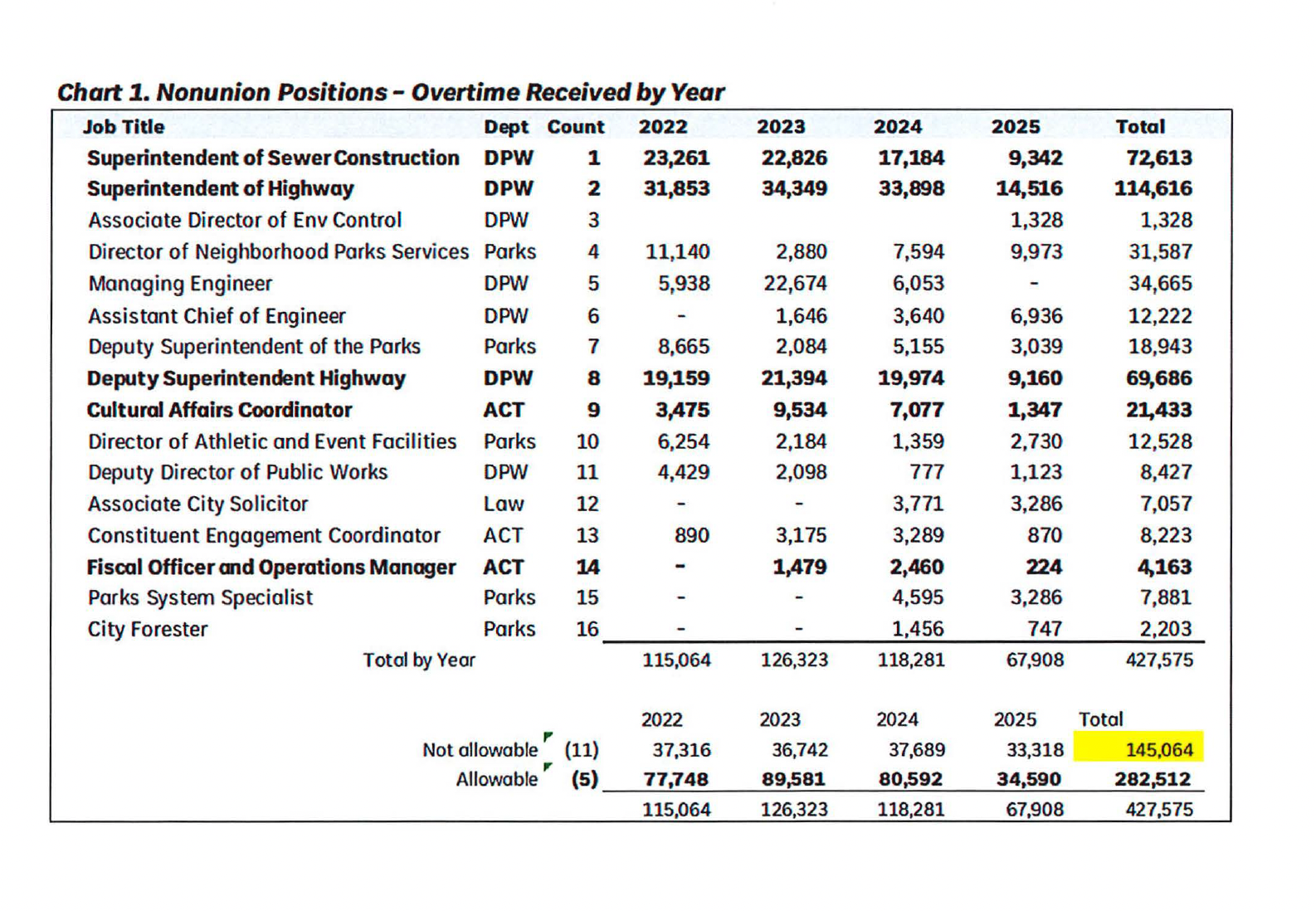 “The scope of the audit is from January 1, 2022, through February 28, 2025. For this time period, sixteen (16) nonunion employees received $427,575 for various types of overtime. Only five (5) of the sixteen (16) properly received overtime, in total amount of $282,512. Eleven (11) were in violation and collected $145,064 in overtime,” states the internal auditor’s report.