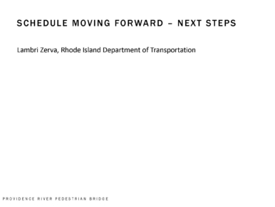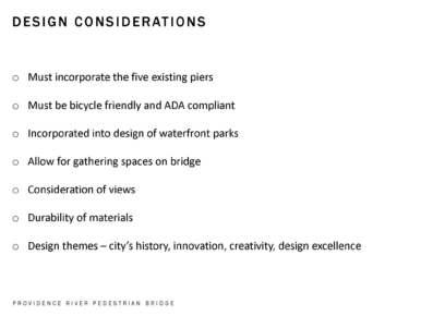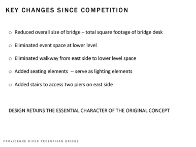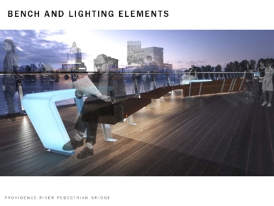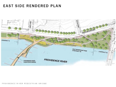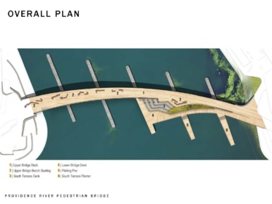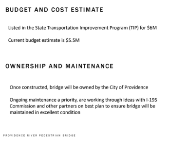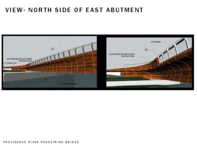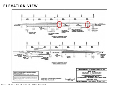 “The Providence River Pedestrian Bridge (project cost is $21.9 million) is not a typical highway bridge. It includes architectural features and uses specially fabricated items not usually associated with our bridges,” said Charles St. Martin, spokesman for the RIDOT.