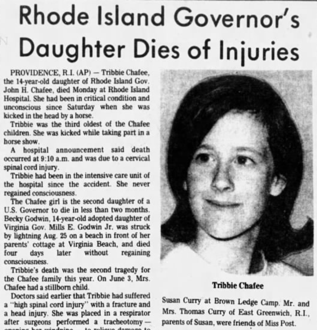 For Chafee, this was the darkest of times. His daughter Tribbie had been killed in an accident in October and then he lost the governorship in November. He was out of office and not yet 50 years old.