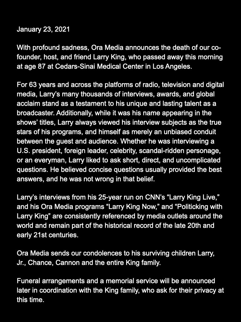 “With profound sadness, Ora Media announces the death of our co-founder, host, and friend Larry King, who passed away this morning at 87.”