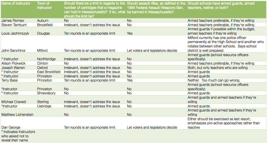 Of the instructors polled, 87.5% reported they would like to see armed guards, teachers or both in schools. In addition, 75% of the respondents said they were against the outlawing of assault rifles, as defined by the 1994 Federal Assault Weapons Ban, in Massachusetts.