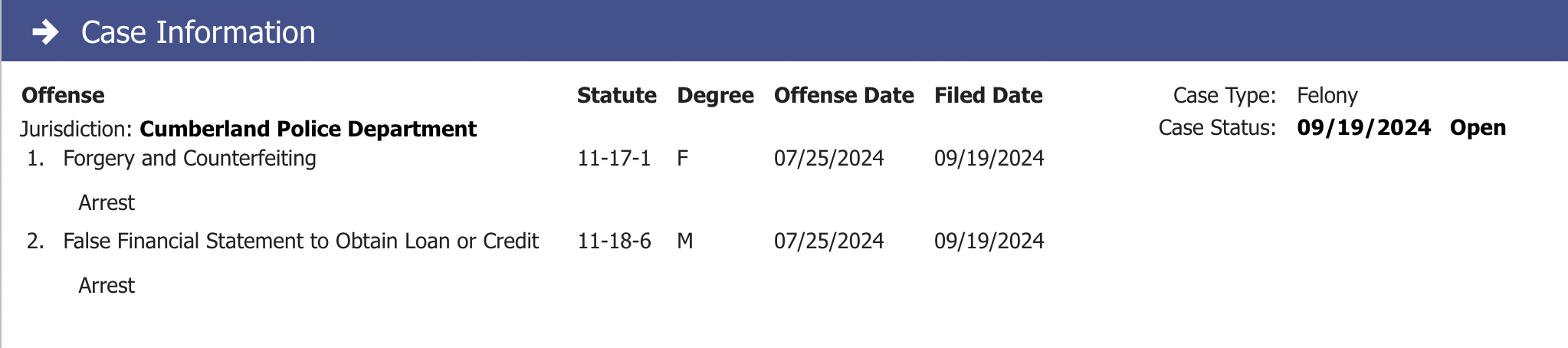 According to Rhode Island court documents, Aubin was charged with one felony count of forgery and counterfeiting and one misdemeanor count of filing a false financial statement to obtain a loan or credit.