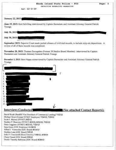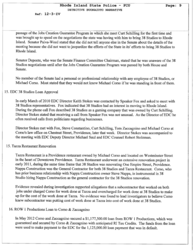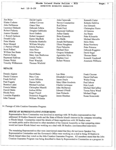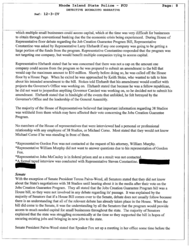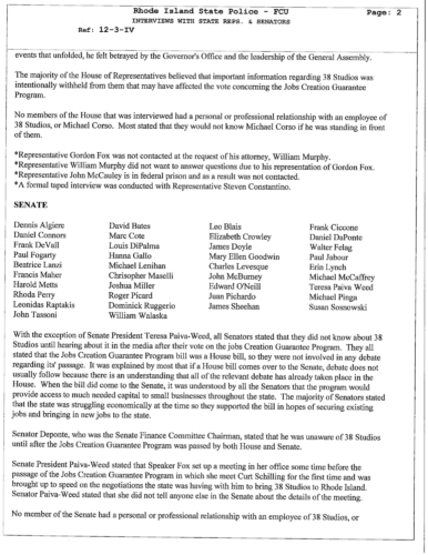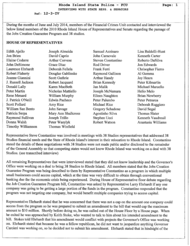 The documents unveil that many of the legislators who were interviewed claimed that the had no knowledge of the guarantee loan program legislation was intended to benefit 38 Studios. Two powerful legislators Senate President Teresa Paiva Weed and House Finance Chair Steven Costantino admitted they knew the legislation was intended to benefit 38 Studios. The claimed they did not tell members to keep other states from competing to land Curt Schilling's gaming company.