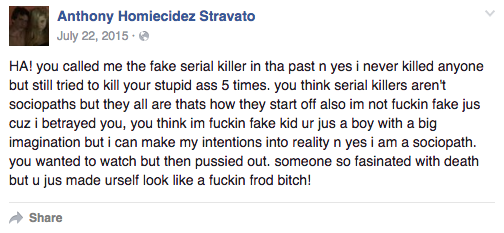 In one post, Stravato said he was a socialpath, and that’s how “all serial killers start off.”