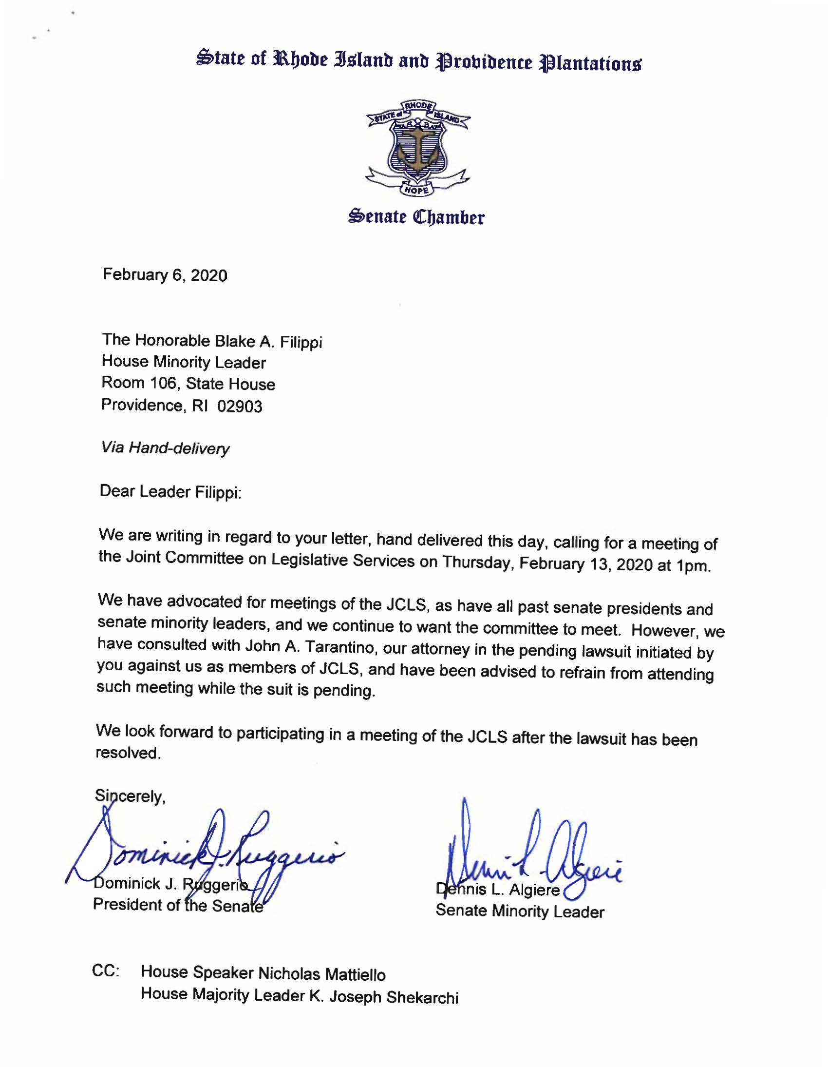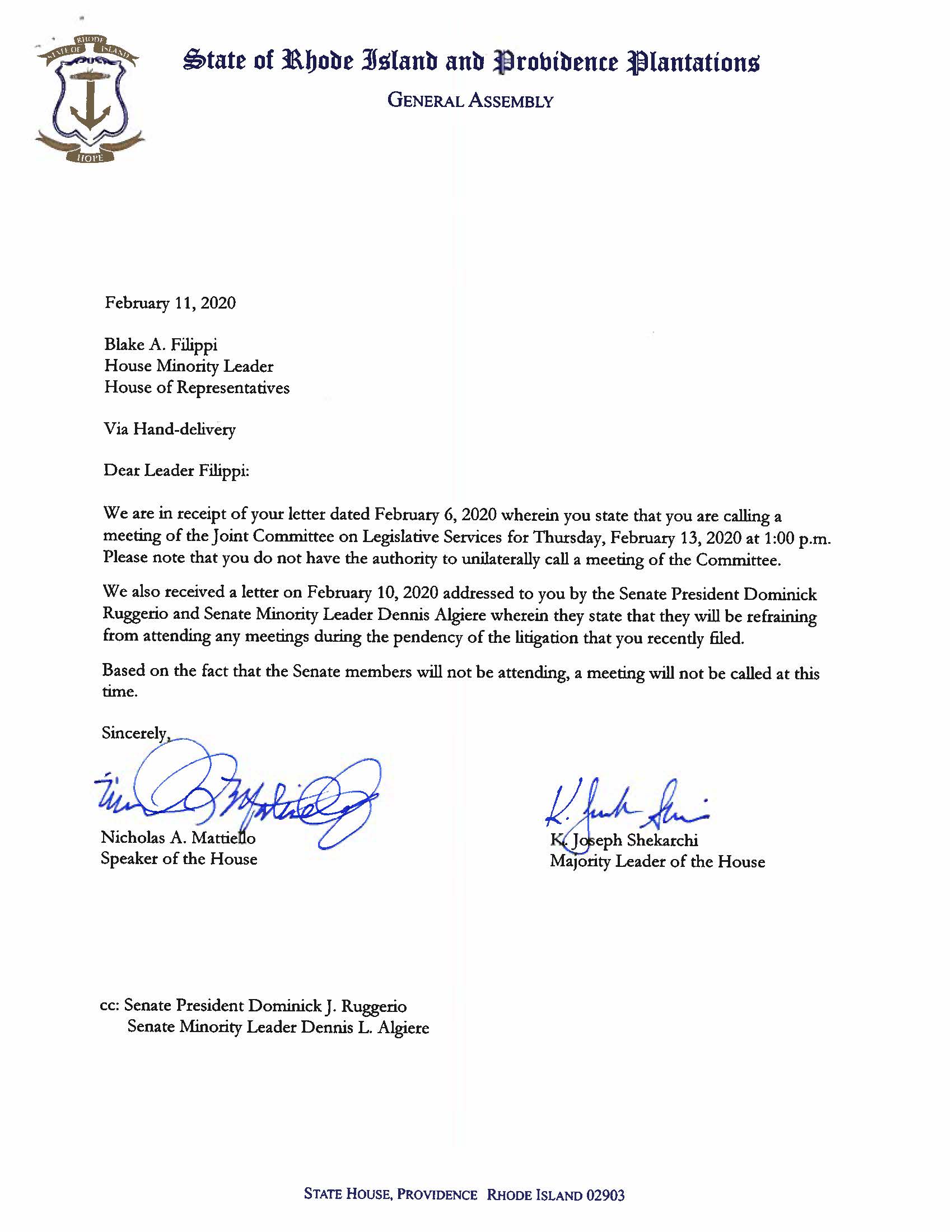 In the Senate response, they said they would not meet because of Filippi’s lawsuit naming them, following Mattiello’s order of an audit of the Rhode Island Convention Center on behalf of the JCLS.