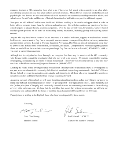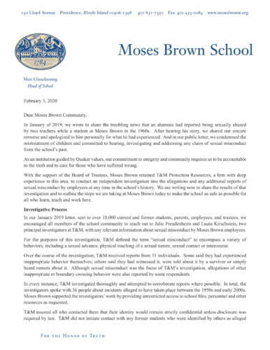 As Moses Brown’s current Head of School, I am deeply sorry for the harm that was done to children under our care, and I am appalled that, at several points in our past, some members of this community failed in their most basic duty to keep students safe. On behalf of the school, I want to apologize to all those who were impacted by employee misconduct and thank them for their courage in coming forward.
