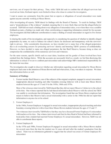 We remain committed to hearing, investigating, and addressing all claims of sexual misconduct. Those who wish to come forward at any time may reach out to the investigators at mosesbrown@tmprotection.com or (646) 445-7707.