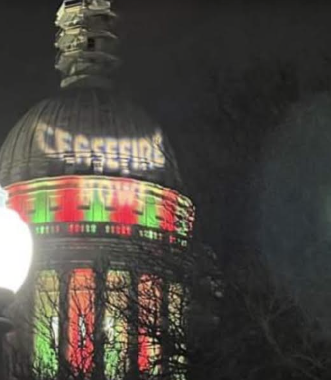 The words “Ceasefire Now” were projected onto the Rhode Island State House dome.
