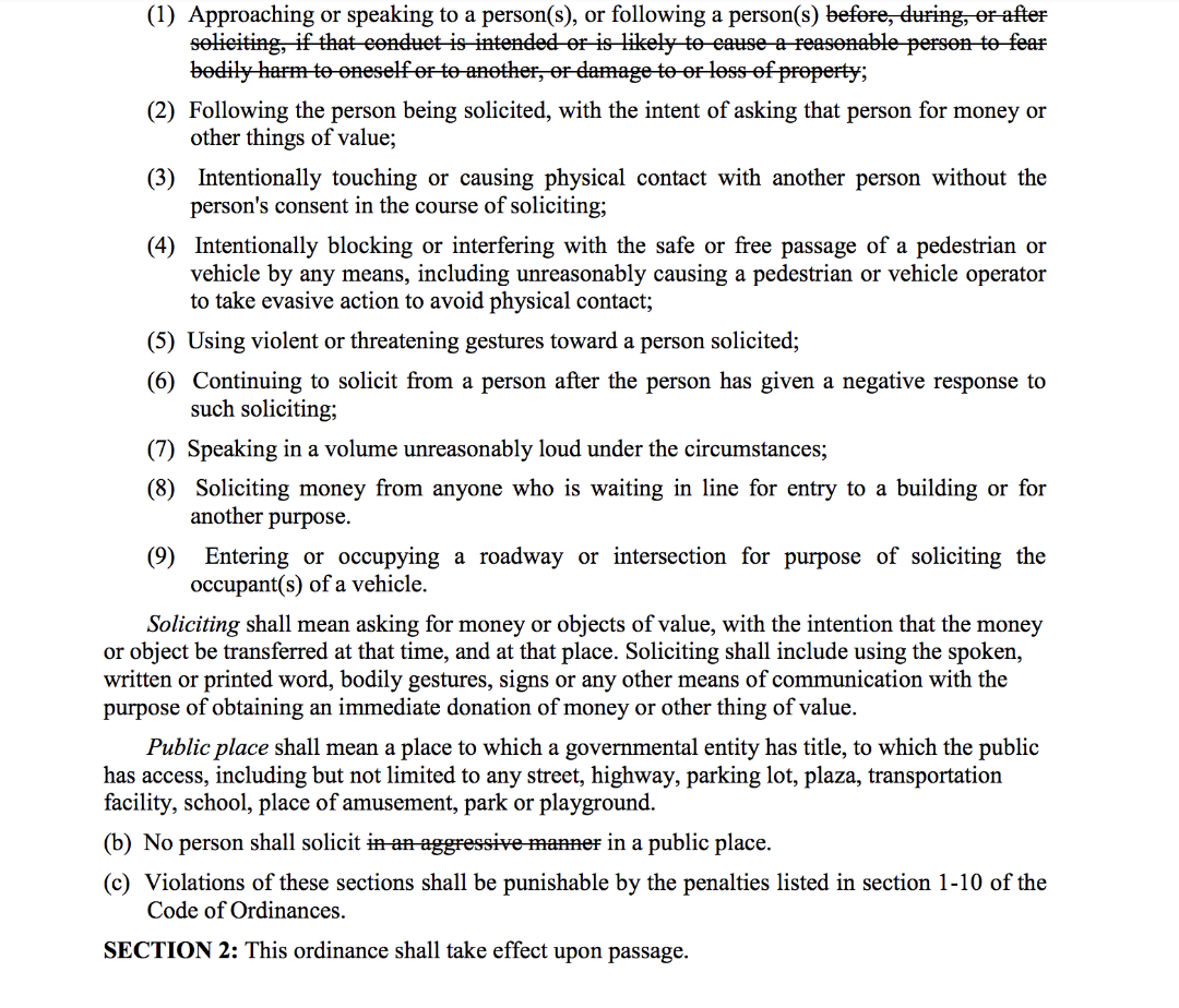 The current ordinance as written says “no person shall solicit in an aggressive manner in a public place” — the proposed change would be to “no person shall solicit in a public place.”