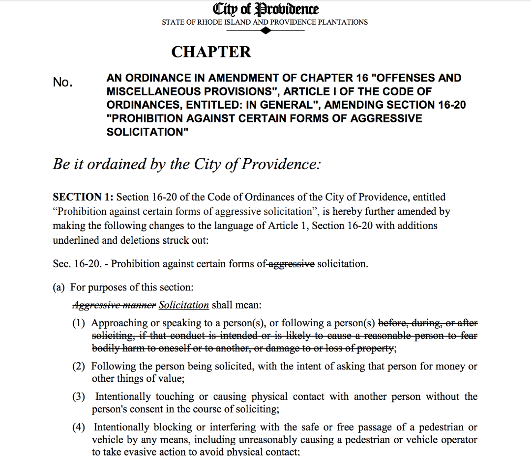 Narducci’s proposal to amend the city’s existing solicitation ordinance is coming before the Providence City Council Thursday night — and would prohibit against not just “aggressive” solicitation — but solicitation in general.