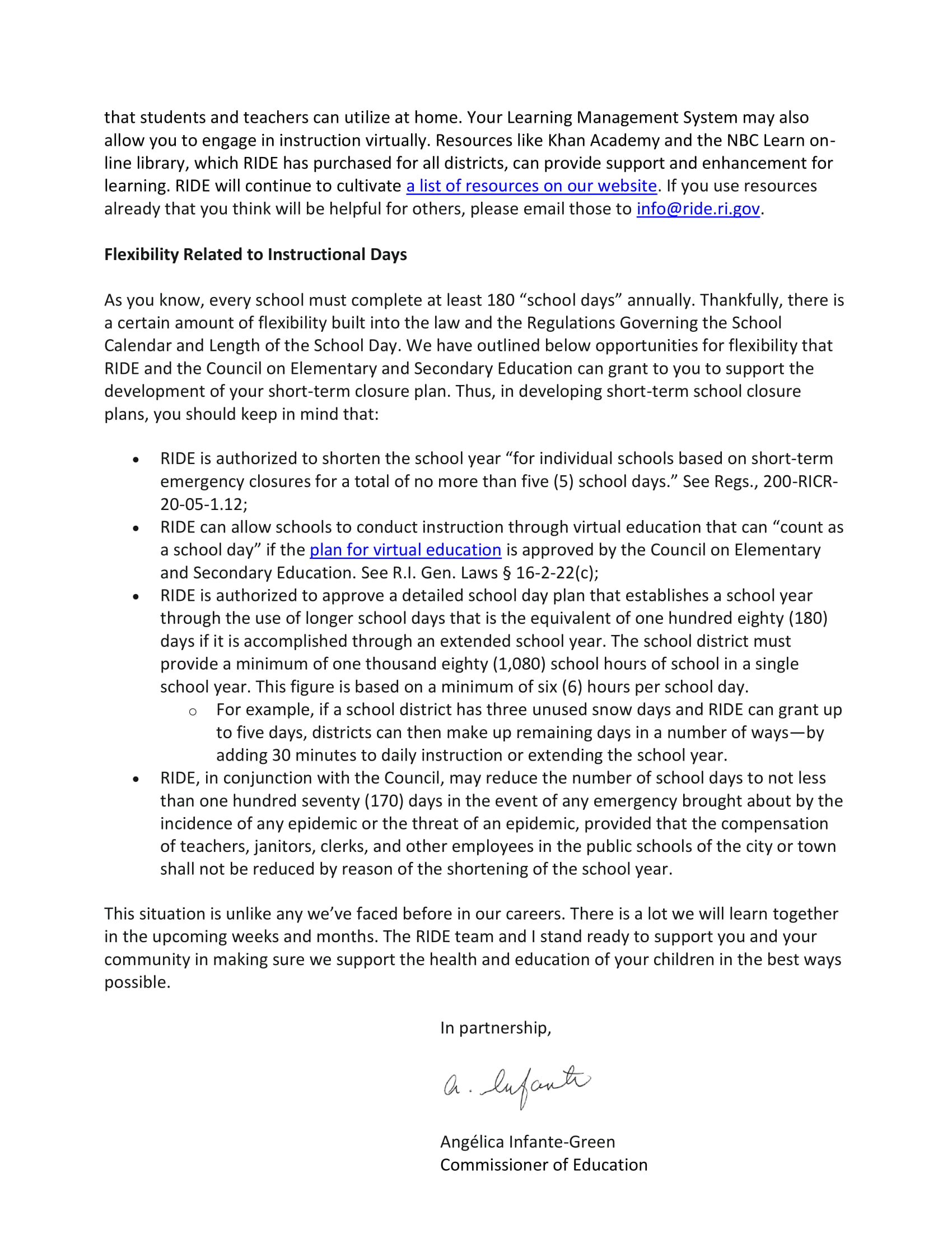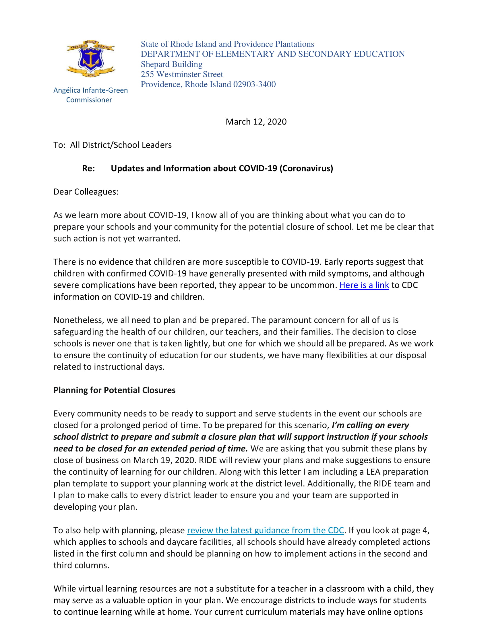 “This situation is unlike any we’ve faced before in our careers. There is a lot we will learn together in the upcoming weeks and months. The RIDE team and I stand ready to support you and your community in making sure we support the health and education of your children in the best ways possible,” concluded Infante-Green.