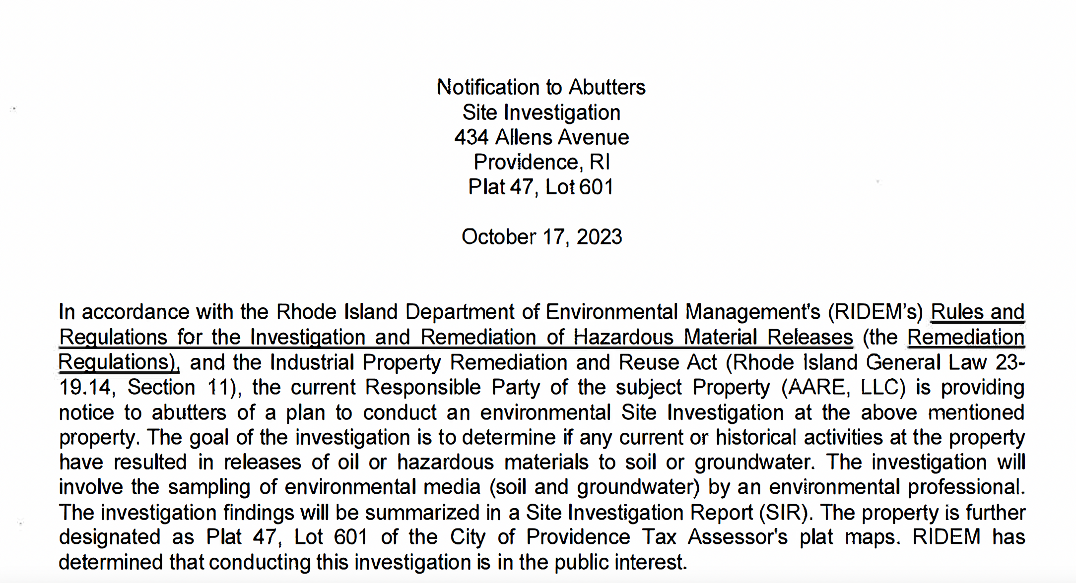 "The current Responsible Party of the subject Property (AARE, LLC) is providing notice to abutters of a plan to conduct an environmental Site Investigation at the above-mentioned property. The goal of the investigation is to determine if any current or historical activities at the property have resulted in releases of oil or hazardous materials to soil or groundwater.”