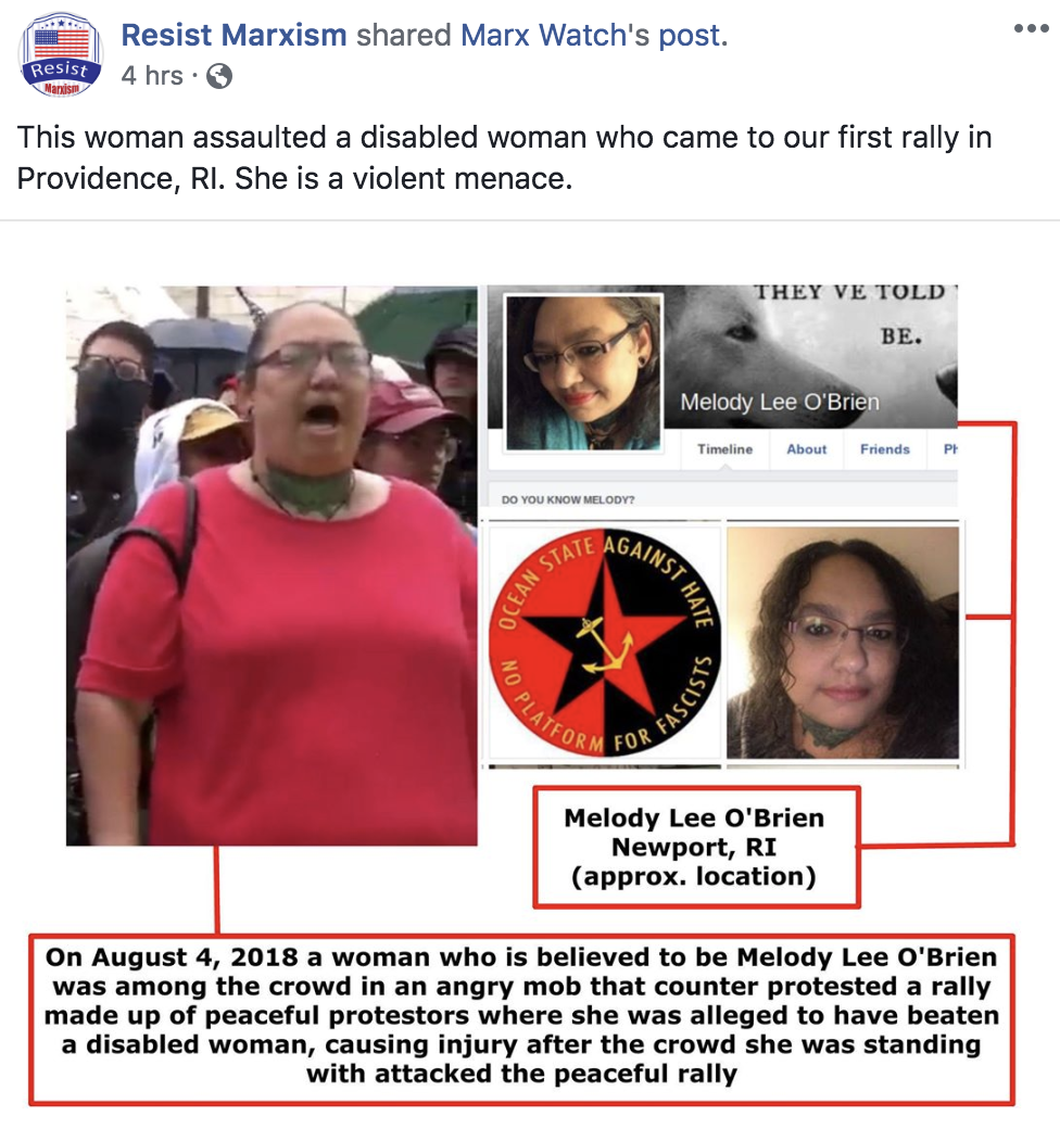 The allegation, which was posted by "Marx Watch" and shared by "Resist Marxism," said that Melody Lee O'Brien assaulted a woman at the August 4 rally -- and was used in promotional video for Resist Marxism's rally at the Rhode Island State House on October 6. Resist Marxism stated: