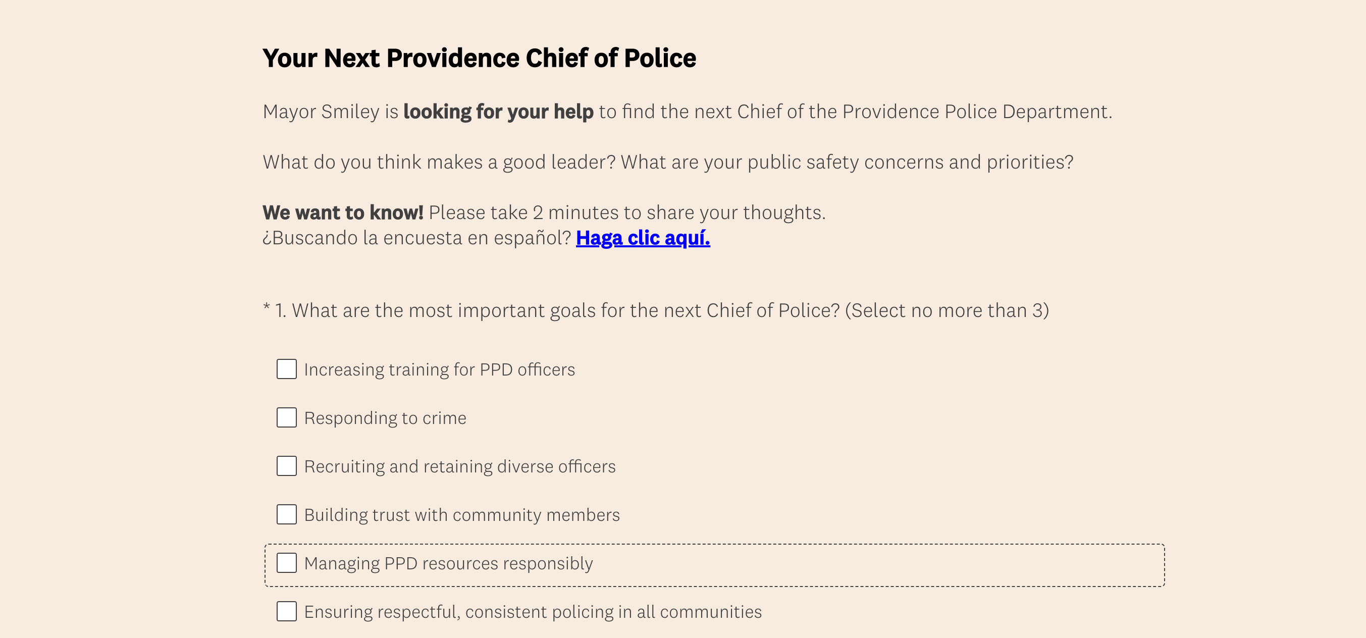 The first question of the survey asks, “What are the most important goals for the next Chief of Police?”