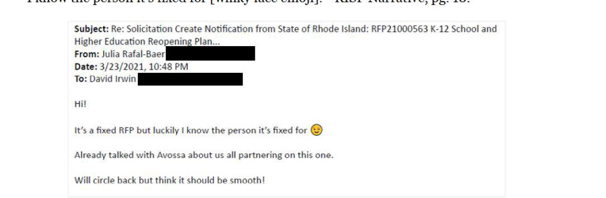 An email by DOA sent by Rafal-Baer on the same day that the School Reopening RFP was posted by the DOA further supports the conclusion that the procurement process was manipulated from the outset. When an out-of-state consulting colleague inquired with Rafal-Baer about the RFP, she responded in the below email, "It's a fixed RFP but luckily I know the person it's fixed for [winky face emoji]."