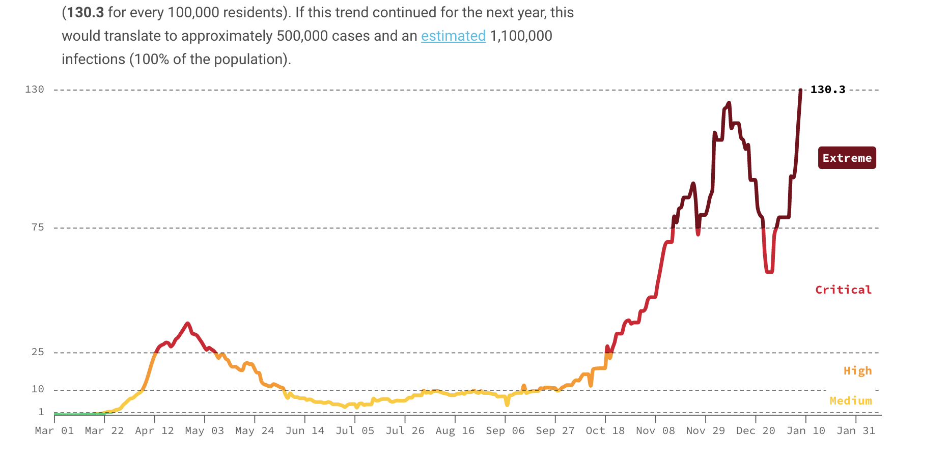 Rhode Island has now hit its highest level of infection — 130 cases per 100,000. The previous high mark was December 9 when the state recorded 123 cases per 100,000.