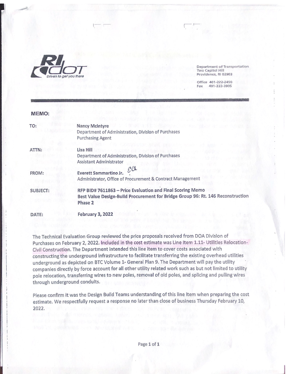 Rogers said, “I hope my colleagues in the Senate will conduct immediate oversight hearings into the bidding process for the 146 project. We need to determine why the winning bidder is costing taxpayers $35 million more than other respectable companies. RIDOT spends tons of taxpayer dollars and the way they spend it is deserving of scrutiny.”